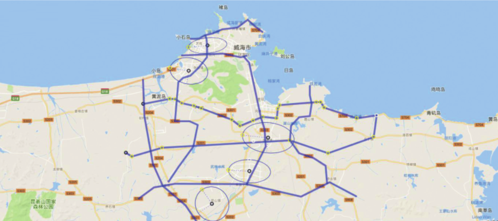 本次项目设计范围为威海市环翠区、文登区、荣成市、乳山市,以及经济技术开发区(国家级)、火炬高技术产业开发区(国家级)、临港经济技术开发区(国家级)内的县乡道路智能交通安全系统建设。项目方案设计坚持以人为本、安全发展的理念,以“防事故、控违法、保畅通”为目标,以事故多发、易发路段为重点,采用点线面相结合的管控模式,在威海市形成“四纵、五横、五个重点管控区”为核心的交通安全管控体系,即通过科学规划县乡主要道路的卡口、电警、测速点位,与前期建设点位有机结合,在县乡范围内形成静态分割的多个闭合区域,闭合区域内部的重要分叉口以视频监控动态管控,实现对交通事故多发路段的全面监管,确保车辆轨迹清晰、全程留痕。