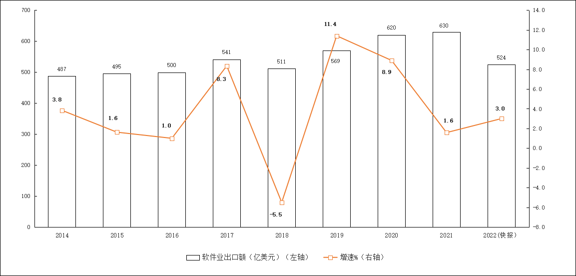 软件业务出口保持增长。2022年,软件业务出口524.1亿美元,同比增长3.0%,增速较上年同期回落5.8个百分点。其中,软件外包服务出口同比增长9.2%。