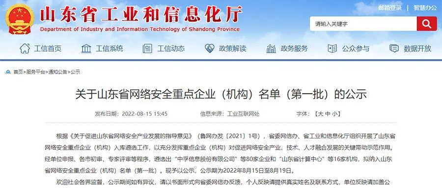 8月15日,山东省工业和信息化厅发布了《关于山东省网络安全重点企业(机构)名单(第一批)》的公示,伟德bv1946官网成功入选。未来伟德bv1946官网将在省委网信办、省工业和信息化厅的统筹领导下与省内其他同行一起充分发挥重点企业(机构)对促进网络安全产业、技术、人才融合发展的关键带动示范作用,促进数据安全产业现代化、高质量发展,擎旗奋进谱写正中新篇。