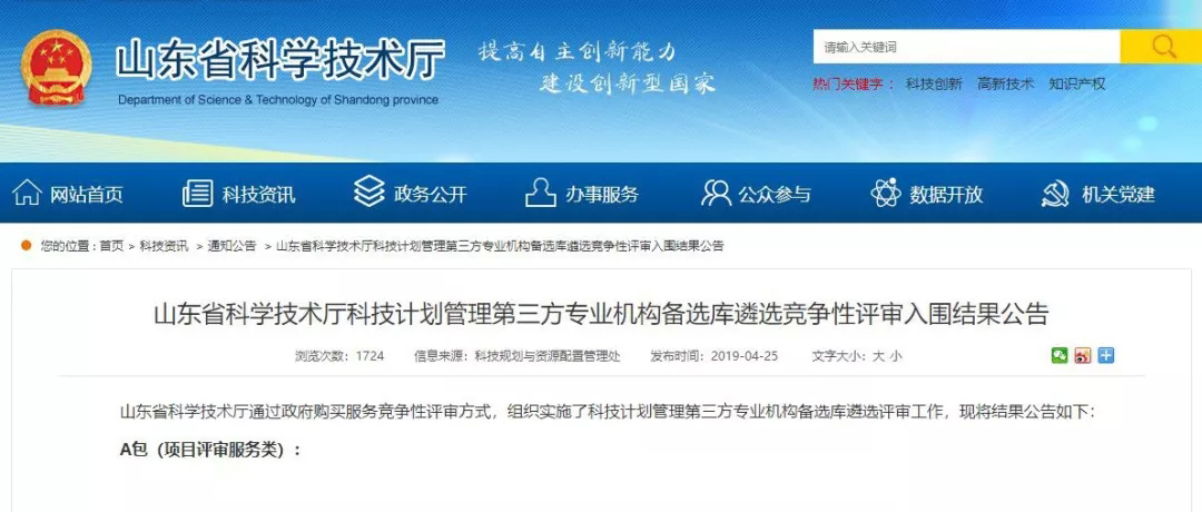 4月24日,山东省科学技术厅科技规划与资源配置管理处就“山东省科学技术厅科技计划项目管理第三方专业机构备选库遴选”项目开展竞争性评审,伟德bv1946官网咨询服务团队凭借综合实力和丰富的类似服务项目经验,成功入围科技计划项目评审服务库和项目绩效评价库。这是伟德bv1946官网继入围山东省财政厅项目绩效评价库之后再次得到项目主管部门的认可,充分证明了伟德bv1946官网在项目绩效评价类工作的能力,且具备较强的实施基础。